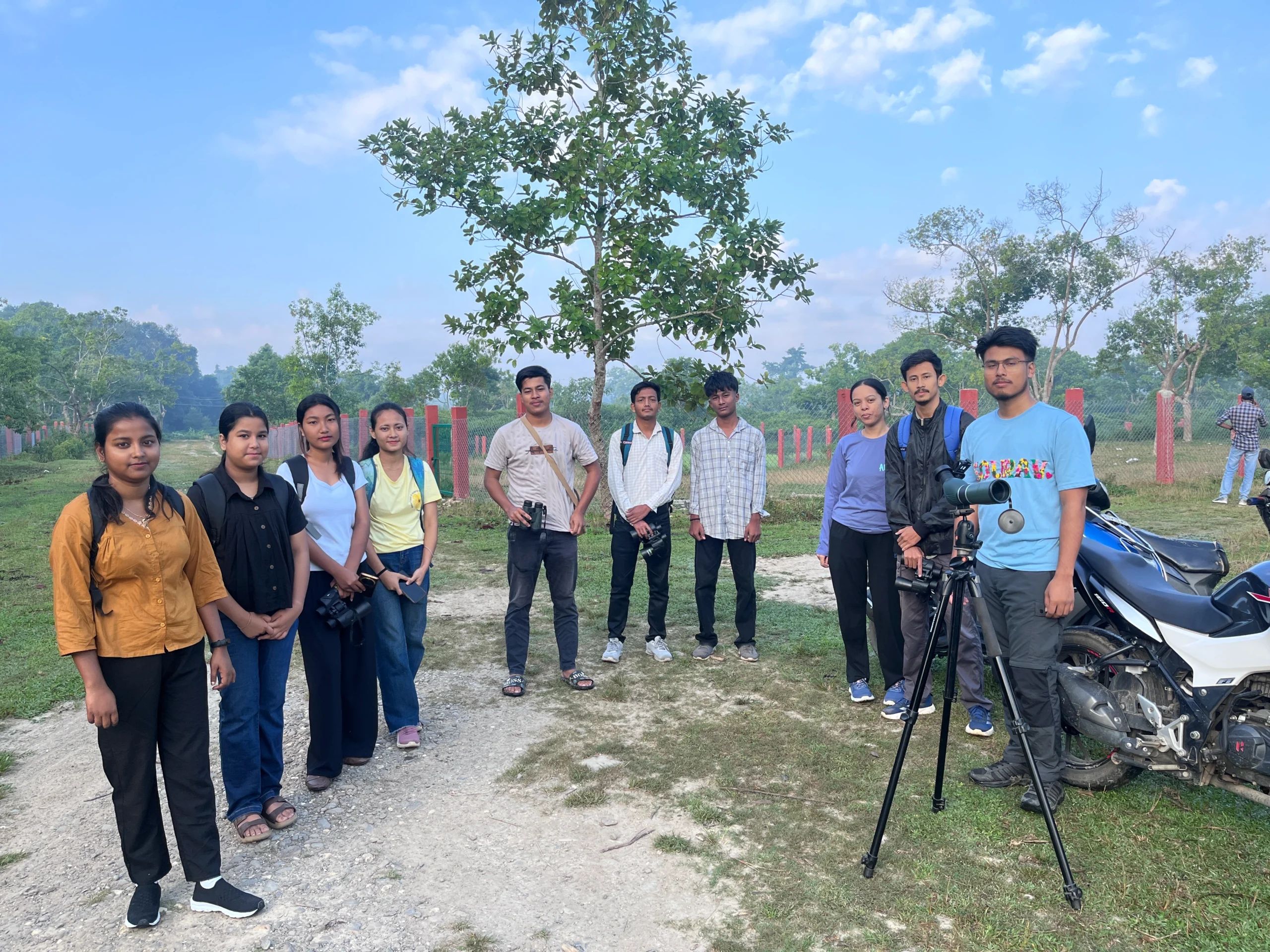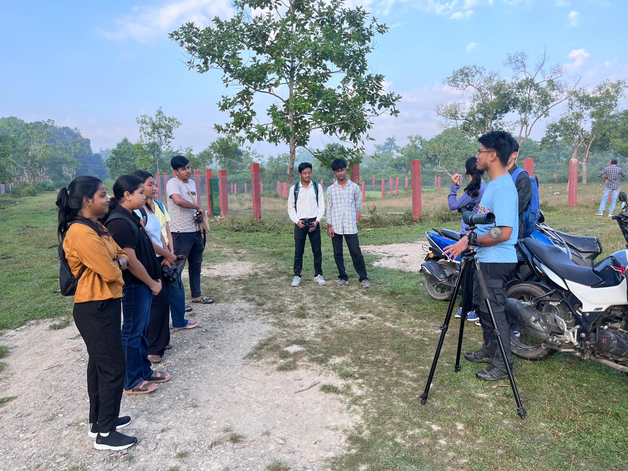 The bird walk at Muga Sumoni, Assam, led by Sourav Pegu, saw the participation of 10 enthusiastic bird lovers who gathered early in the morning to explore the region’s lush avian habitats. Sourav began the session by demonstrating how to properly use binoculars and a spotting scope, helping participants get comfortable with field equipment. He also explained the basics of bird identification and nomenclature, sharing insights into how features like size, color, behavior, and calls can help distinguish species in the field.